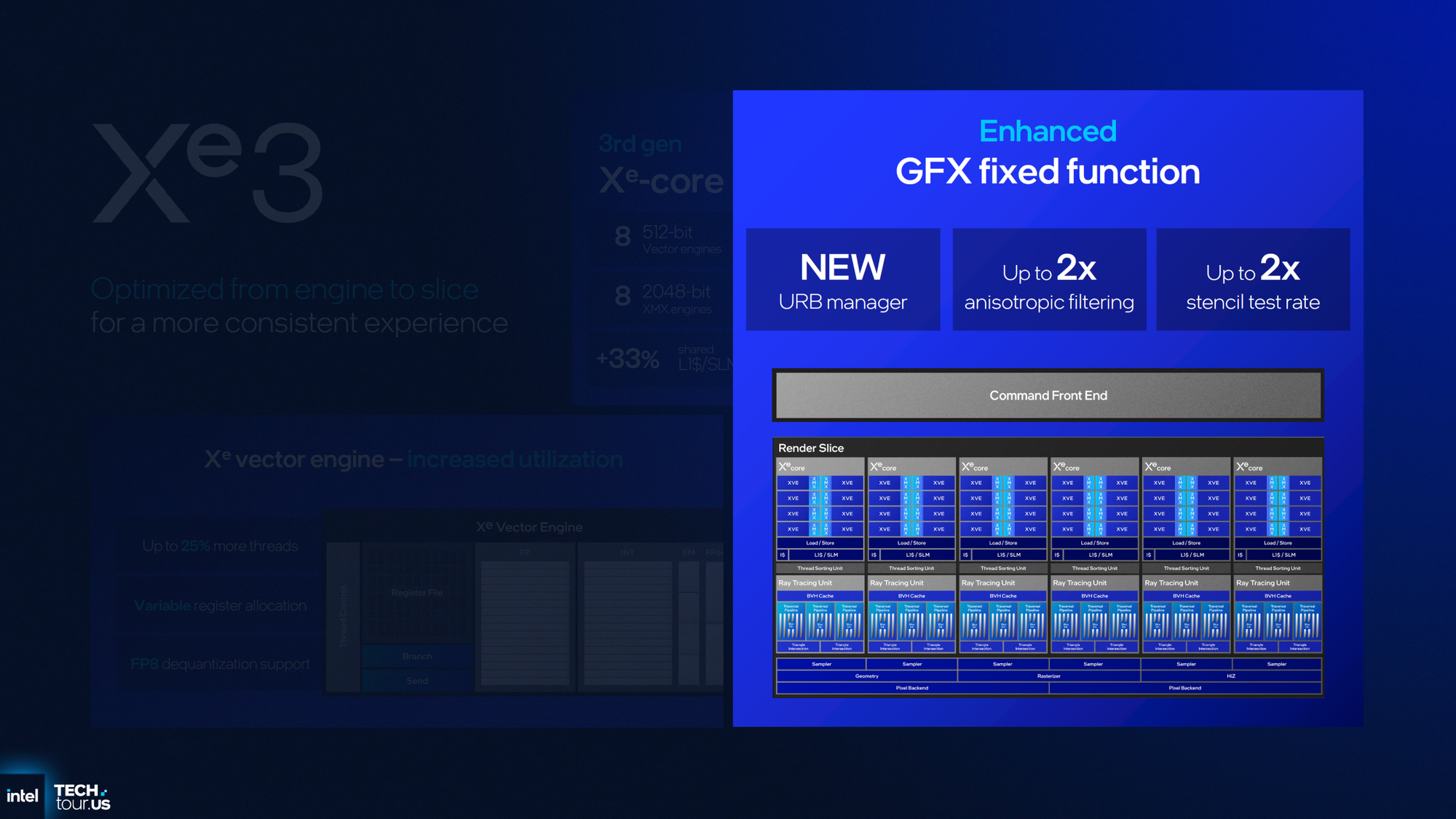 Pronta a debuttare all'interno dei processori Intel Panther Lake, nome commerciale Intel Core Ultra 300, la nuova architettura punta soprattutto sulla scalabilità: le Render Slice della GPU passano da 4 a 6 Xe Core e da 4 a 6 unità Ray Tracing, un aumento del 50% che si riflette in maniera lineare sulle prestazioni.